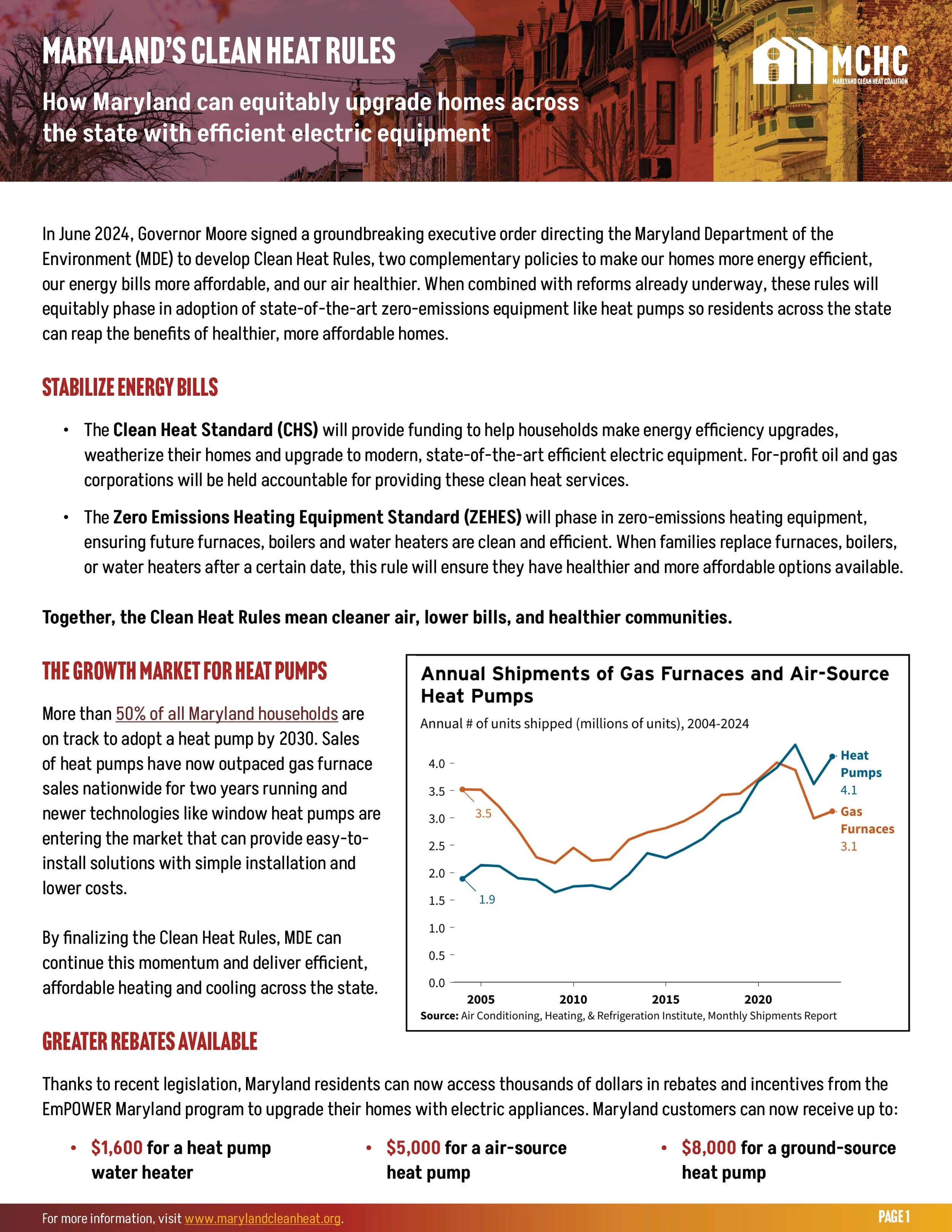 The Maryland Clean Heat Coalition (MCHC) submitted comments to Governor Moore and the MD Commission on Climate Change, advocating for the development of a heat pump market transformation roadmap. The MCHC emphasizes that upgrading homes with clean, efficient systems like heat pumps can lead to healthier air, affordable energy, and healthier communities in Maryland, addressing issues like poor air quality, high energy bills, and climate goals. Read more here